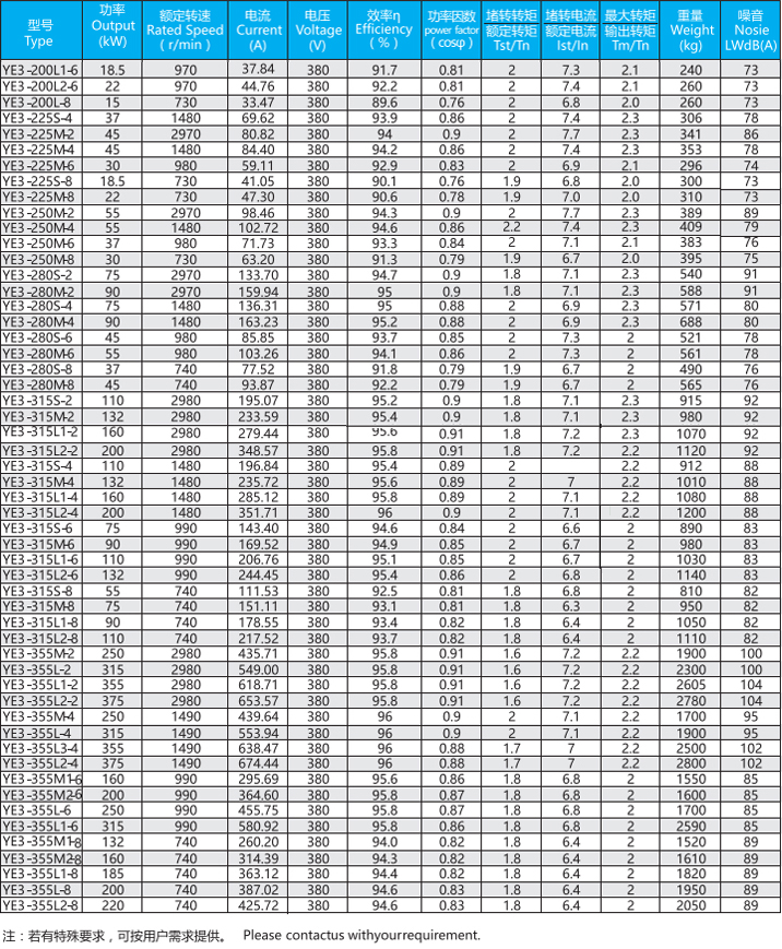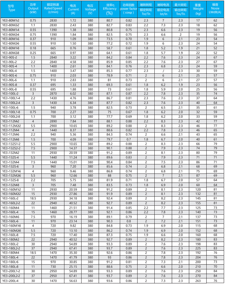 YE3系列(中心高H80-355mm、0.55-375kw)電動機是全封閉、自扇風冷式鼠籠型三相異步電動機,產(chǎn)品能效與EC60034-30的IE3保持一致。一般電壓為380V、頻率為50Hz也可按客戶要求定制。工作環(huán)境-15-40°C,海拔不超過1000M,絕緣等級F(B極考核)防護等級IP55、冷卻方式IC411、工作制S1、安裝方式符合IEC和DIN標準。